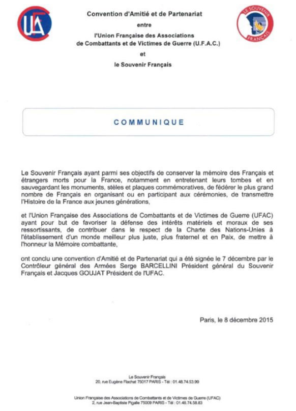 Une convention de partenariat a été signée le 7 décembre 2015 entre Le Souvenir Français et l’Union Française des Associations de Combattants et de Victimes de Guerre (UFAC).