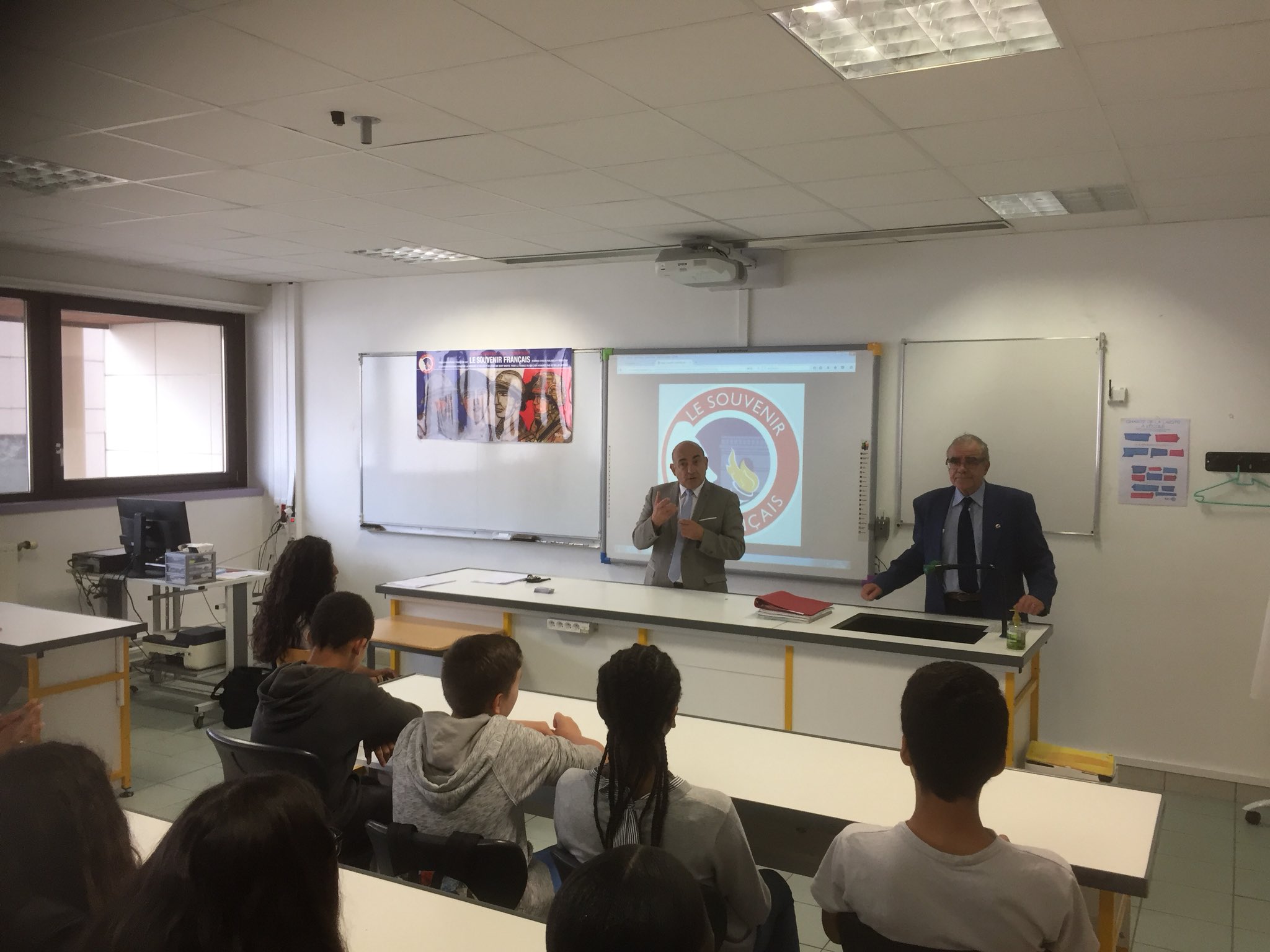 Claude GUY, délégué général des Hauts-de-Seine pour le Souvenir Français et Xavier MELARD, président du comite local Asnières – Clichy ont offert 30 cartes d’adhérents aux élèves de la 4ème défense et citoyenneté du collège Jean MACE, partenaire de l’association depuis 2014. Lors de cette année scolaire, les élèves de cette classe ont participé avec leur professeur et leur principal d’établissement, à de nombreuses commémorations, sans oublier la quête nationale en novembre dernier.