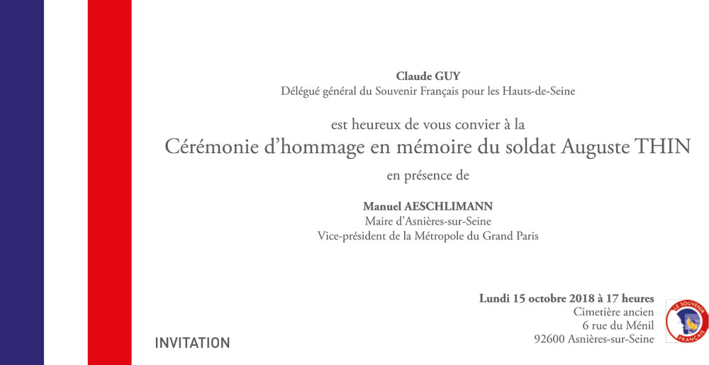 AsnièresEvénementsgrande guerreHistoireInformationSouvenir Français Cérémonie en hommage à Auguste THIN – Lundi 15 octobre à 17h en présence de la flamme sacrée. 09/10/2018 adminsf Pour télécharger l’invitation en format PDF: cliquer ici. Tweet